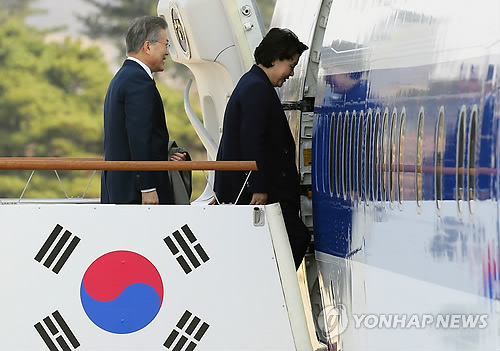 전용기 탑승하는 문 대통령 내외(성남=연합뉴스) 황광모 기자 = 베트남을 국빈 방문하는 문재인 대통령과 부인 김정숙 여사가 22일 오전 서울공항을 통해 출국, 전용기에 탑승하고 있다.