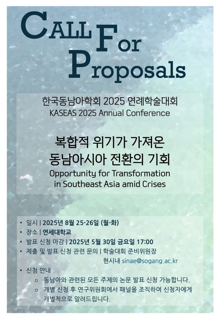 - 논문제출 및 발표 신청 관련 문의: 2025년 한국동남아학회 학술대회 준비위원장 현시내(sinae@sogang.ac.kr)
