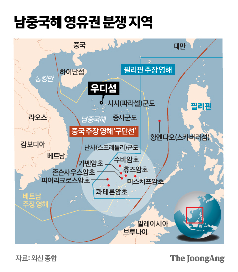 중국은 1953년부터 ‘남해 구단선’(南海 九段線)이란 자의적 해상 경계선을 긋고 남중국해의 90%가 자신의 소유라고 주장해왔다. 이후 필리핀은 물론 베트남, 말레이시아, 브루나이와도 90년 넘게 갈등을 빚어오고 있다.