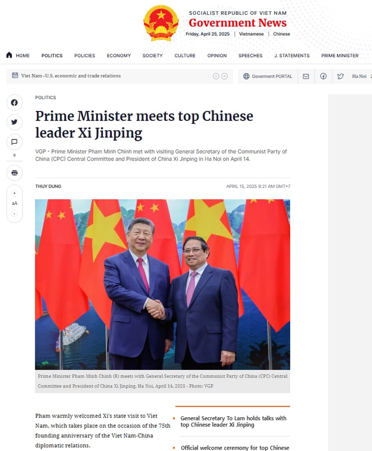 시 주석은 4월14일 팜민찐 총리와 가진 정상회담에서 “전략적 소통을 강화하고 함께 패권주의, 일방주의 보호주의에 맞서자”고 말했다고 중국 관영 신화통신은 보도했습니다. 하지만 베트남 정부의 공식 보도문에서는 이 발언을 찾을 수가 없었어요. 또람 공산당 총서기를 만났을 때도 “공동으로 일방적인 괴롭힘에 반대하고 세계 자유무역체제와 산업공급망의 안정을 유지해나가자”고 했지만 역시 베트남 측 발표문에는 이 발언이 빠졌습니다.