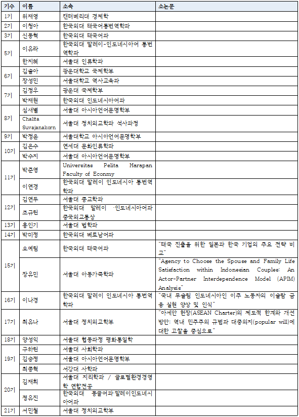 아시아연구소에서는 미래의 아시아 전문가를 양성하는 교육 프로그램과 실무 경험을 결합한 제도인 연구연수생 프로그램을 운영하고 있습니다. 본 프로그램의 다양한 교육과 훈련을 통해 참가자들이 아시아 연구와 연관된 학계 및 사회의 우수한 자원으로 성장할 수 있는 기회를 제공하기 위한 목적입니다. 세부 목표로 연구 및 행정 교육을 통한 기초 역량 증진, 인턴들 간의 협력을 통한 실무능력의 배양, 그리고 연구소 구성원들과 인턴들 간의 유대강화를 통한 사회적 네트워크 형성에 중점을 두고 있습니다. 이를 위해 아시아 연구소 소속 교수 및 연구원들이 아시아연구 각 분야에 대한 기초적인 지식을 소규모 강의를 통하여 전수하고, 연구실무 및 연구행정의 기본과정을 교육하며, 진행 중인 연구 프로그램에 참여함으로써 실무와 연구 경험을 쌓고 네트워크를 형성할 수 있는 기회를 제공합니다. 본 과정은 2014년 2월에 첫 출범하여 2019년 3월 현재 제11기 연구연수생들이 활동 중에 있습니다.