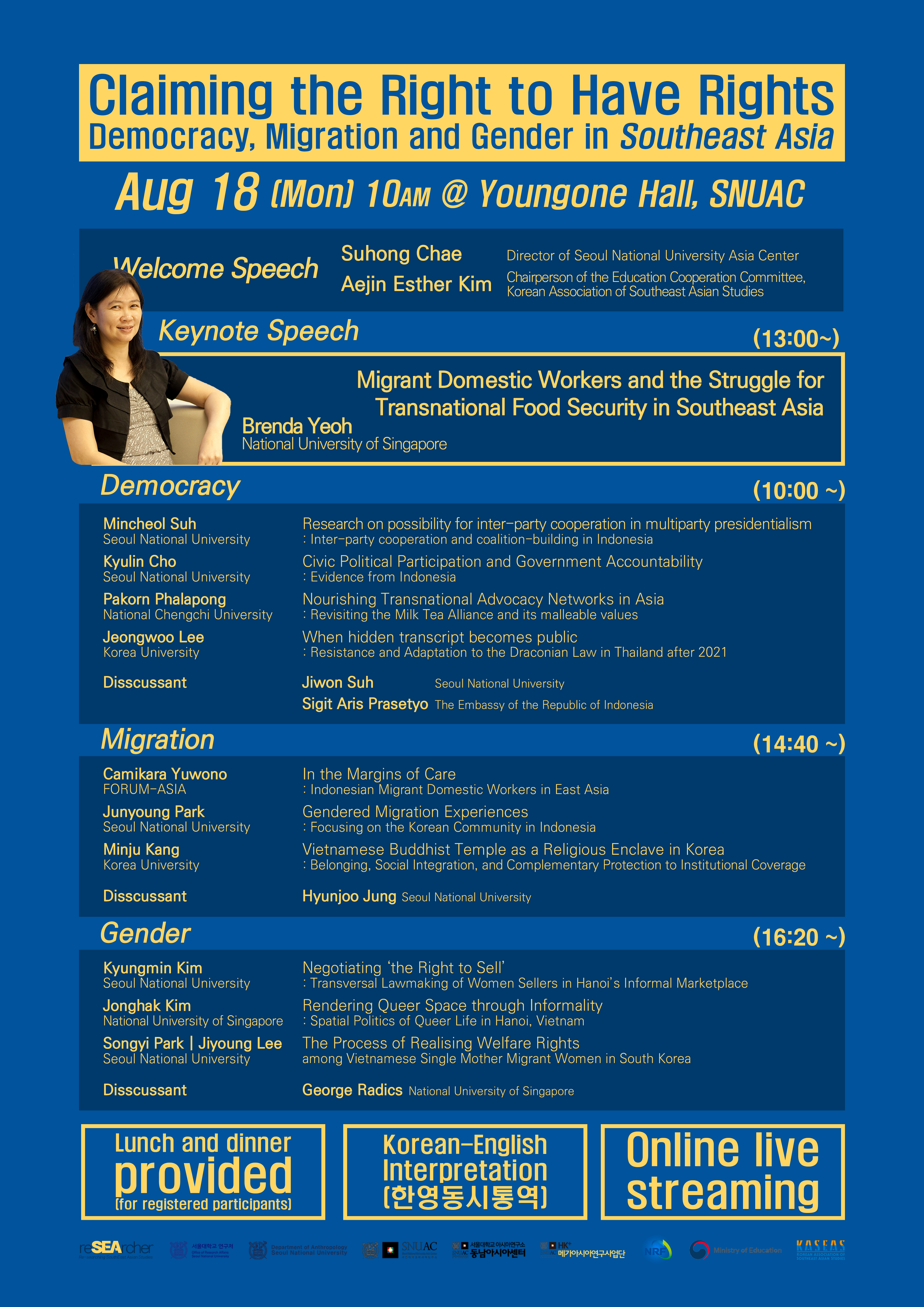 - Venue: Youngone Hall (2nd floor), Asia Center, Seoul National University (Live streaming on YouTube)